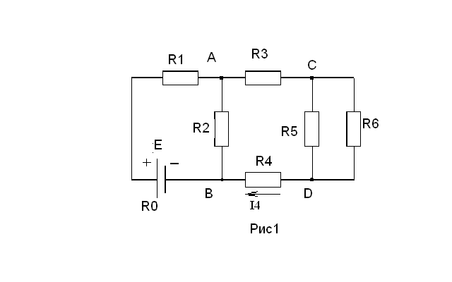 В цепи со смешанным сопротивлением (рис. 1) UCD=U5=100 В, I4=6 А, R1=40 Ом, R2=86 Ом, R3=10 Ом, R4=14 Ом, R5=50 Ом, R0=0,4 Ом. Определить R6, ЭДС E, токи и напряжения и мощность каждого участка цепи и всей цепи. Составить баланс мощностей.