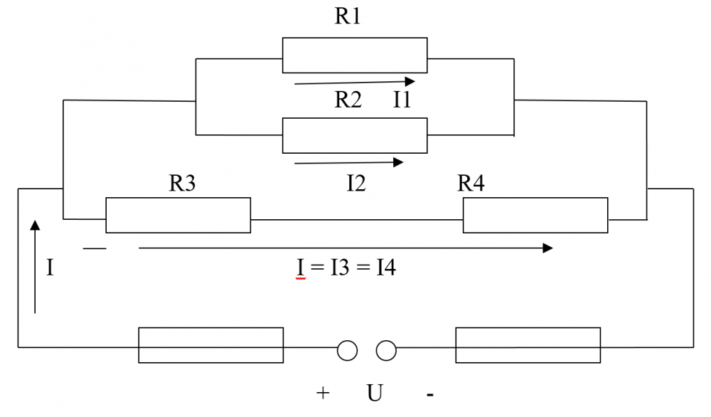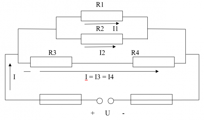 Для студентов по предмету Теоретические основы электротехники (ТОЭ)Цепь постоянного тока со смешанным соединением состоит из четырех резисторов. Сопротивления резисторов R1=30 Ом, R2=20 Ом, R3=4 Ом, R4=2 Ом; напряжениЦепь постоянного тока со смешанным соединением состоит из четырех резисторов. Сопротивления резисторов R1=30 Ом, R2=20 Ом, R3=4 Ом, R4=2 Ом; напряжени