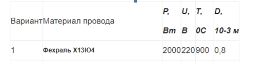 Задача № 1. Найти длину провода диаметром м для изготовления нагревательного элемента мощностью 2000 Вт и напряжением 220 В. Рабочая температура нагревательного элемента равна 900 . Найти изменение сопротивления нагревательного элемента относительно комнатной температуры (20 ).