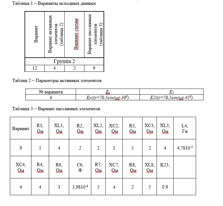 Для заданного варианта схемы цепи с параметрами активных элементов, указанных в таблице 2 и параметрами пассивных элементов из таблицы 3 выполнить: