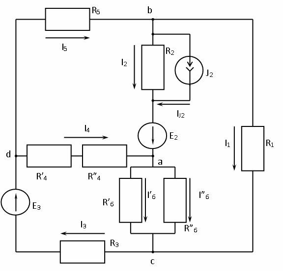 1. Упростить схему, заменив последовательно и параллельно соединённые резисторы четвёртой и шестой ветвей эквивалентными. Дальнейший расчёт вести для упрощённой схемы.