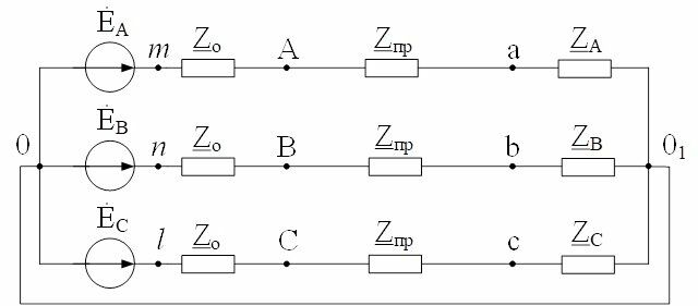 В трехфазную сеть с нулевым проводом (рис. 3.2) к симметричному трехфазному генератору с фазной ЭДС EA=220 В и внутренним сопротивлением Z0=0,2+j∙0,3 через линию электропередачи, сопротивление каждого провода которой Zпр=1,5+j∙2,8, подключена несимме