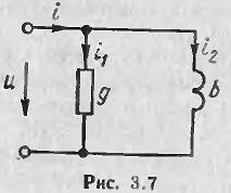 Найти комплексные значения входной проводимости и входного сопротивления, а также мгновенные значения приложенного напряжения и токов в ветвях цепи рис. 3.7, если проводимости ветвей g=0,01 См, b=0,02 См, а действующее значение тока на входе I=1 А.