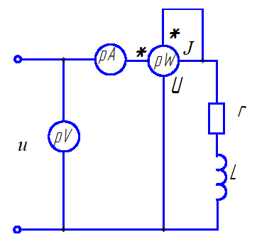 В цепь переменного тока частотой 50 Гц (рис. 2, табл. 2) включена катушка, обладающая активным сопротивлением r и индуктивным сопротивлением XL. К цепи приложено напряжение. Определить показания измерительных приборов, включенных в цепь, а также реактивную и полную мощности цепи. Построить схему замещения цепи для комплексных значений, треугольник сопротивлений и векторную диаграмму тока и напряжений. Определить коэффициент мощности.