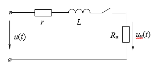 Определить закон изменения во времени напряжения на сопротивлении нагрузки при её подключении к питающей цепи с параметрами r и L и напряжением источника В при частоте Гц (рис. 1.2.1).