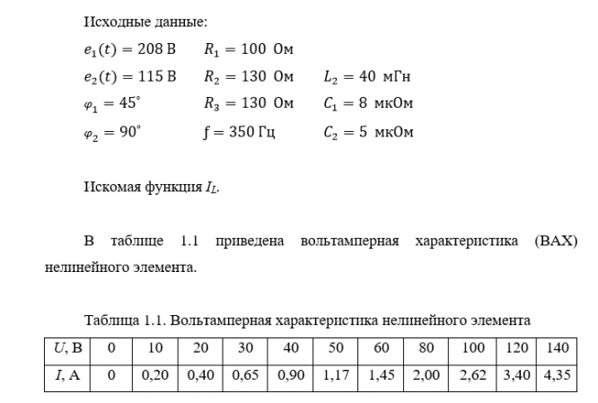 Исследование схемы нелинейной электрической цепи, в которой действуют два однофазных синусоидальных источника с ЭДС: е1(t) = Е1m sin(ωt+φ1), е2(t) = Е2m sin(ωt+φ2) и частотой f. Нелинейный двухполюсник задан вольтамперной характеристикой для действующих значений.