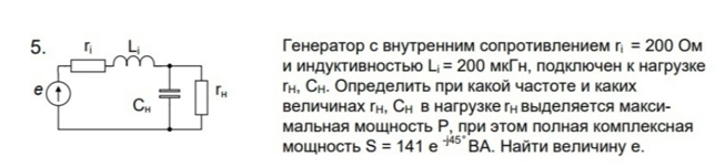 Генератор с внутренним сопротивлением ri = 200 Ом и индуктивностью Li = 200 мкГн, подключен к нагрузке rн, Cн. Определить при какой частоте и каких величинах rн, Cн в нагрузке rн выделяется максимальная мощность P, при этом полная комплексная мощность S=141e-j45° ВА. Найти величину e.