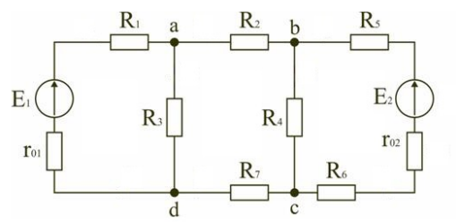 Определить токи во всех ветвях цепи (рис. 34), если ЭДС источников энергии E1 = 50 B, Е2 = 40 В, их внутреннее сопротивление Ro1 = 0,5 Ом; Ro2 = 0,5 Ом; сопротивление резисторов R1 = 10 Ом, R2 = 15 Ом, R3 = 5 Ом, R4 = 5 Ом, R5 = 15 Ом, R6 = 10 Ом, R7 = 20 Ом. Задачу решить методом узловых и контурных уравнений (применяя законы Кирхгофа). Проверить решение методом узлового напряжения. Составить уравнение баланса мощностей.