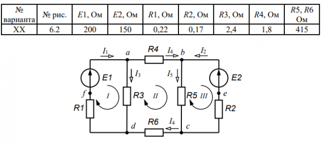 Задача: В цепи (рис. 2.1) ЭДС источников питания равны E1 и E2, а сопротивления ветвей – R1, R2, R3, R4, R5 = R6