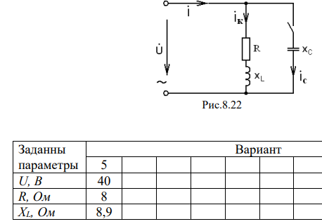 Задача 2. В цепь синусоидального тока напряжением U и частотой f включена катушка с активным сопротивлением R и индуктивным XL рис. 8.22. Определить: 1) Ток в катушке. 2) Коэффициент мощности. 3) Полную, активную и реактивную мощности. 4) Емкость, при которой в цепи наступит резонанс токов. 5) Построить векторную диаграмму. Данные для своего варианта взять из табл. 8.4.