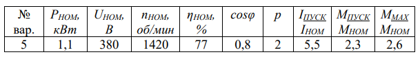 Задача 1. Номинальная мощность трехфазного асинхронного двигателя с короткозамкнутым ротором РНОМ, номинальное напряжение UНОМ, номинальная частота вращения ротора nНОМ, номинальный КПД ηНОМ номинальный коэффициент мощности сosφ, число пар полюсов обмотки статора p, кратность пускового тока β = IПУСК / IНОМ; кратность пускового момента δ =МПУСК/МНОМ; кратность максимального момента λ = МMAX/ МНОМ.