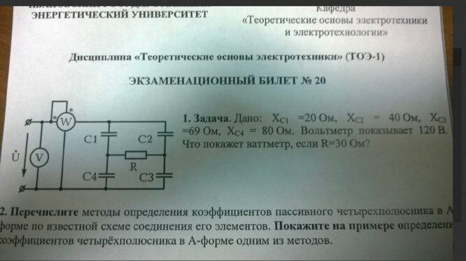 Задача: Xc1=20 Ом; Xc2=40 Ом; Xc3=69 Ом; Xc4=80 Ом. Вольтметр показывает 120 В. Что покажет ваттметр, если R=30 Ом? вариант 20