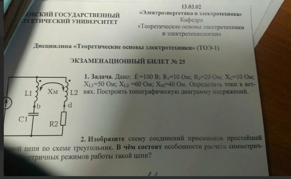 Главная » Учебные материалы » Теоретические основы электротехники (ТОЭ) » Решения задач » ИГЭУ им. Ленина » 4 семестр » Номер 1 » Вариант 25 » E=100 B; R1=10 Ом; R2=20 Ом; XC=10 Ом; XL1=50 Ом; XL2 =60 Ом; Хм=40 Ом. Определить токи в ветвях. Построить топографическую диаграмму напряжений.