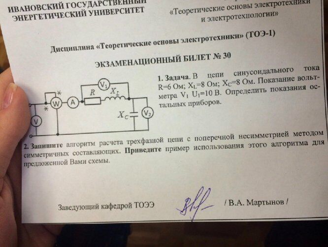 Для студентов ИГЭУ им. Ленина по предмету Теоретические основы электротехники (ТОЭ)В цепи синусоидального тока R=6 Ом; XL=8 Ом; Xc=8 Ом. Показание вольтметра V1 U1=10 В. Определить показания остальных приборов.В цепи синусоидального тока R=6 Ом; XL=8 Ом; Xc=8 Ом. Показание вольтметра V1 U1=10 В. Определить показания остальных приборов.