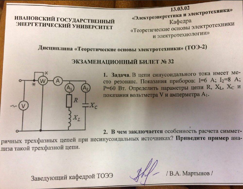 Для студентов ИГЭУ им. Ленина по предмету Теоретические основы электротехники (ТОЭ)В цепи синусоидального тока имеет место резонанс. Показания приборов: I=6 А; I2=8 А; P=60 Вт. Определить параметры цепи R, XL, XC и показания вольтметВ цепи синусоидального тока имеет место резонанс. Показания приборов: I=6 А; I2=8 А; P=60 Вт. Определить параметры цепи R, XL, XC и показания вольтмет