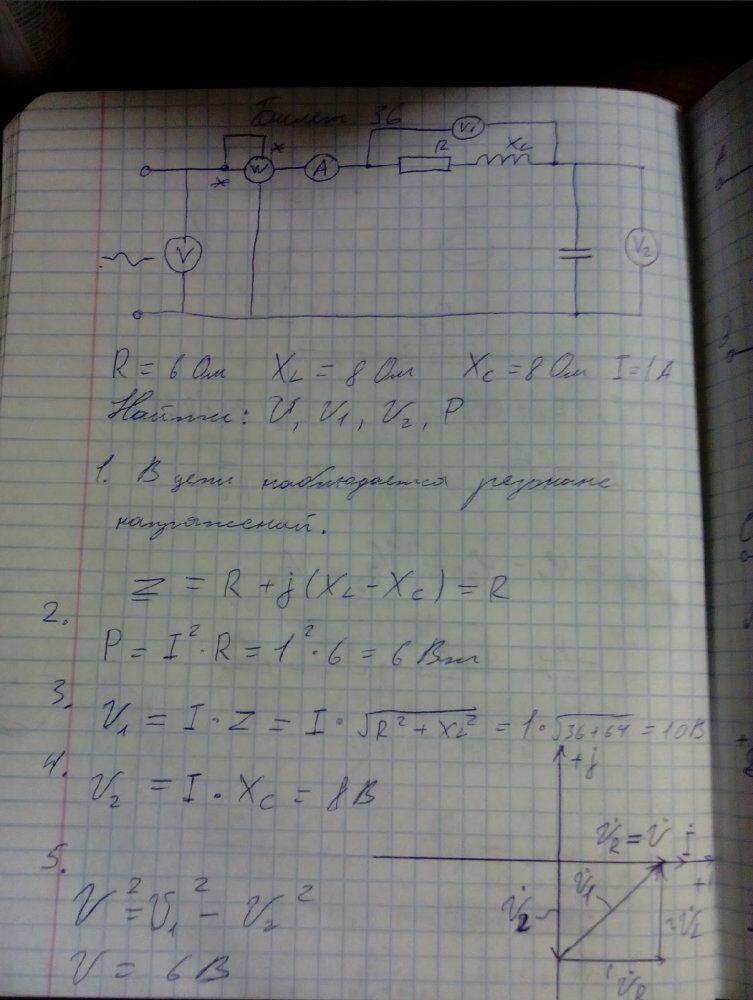 Задача 1: R=6 Ом; XL=8 Ом;Xc=8 Ом; I=1 A. Найти V, V1, V2, P вариант 36