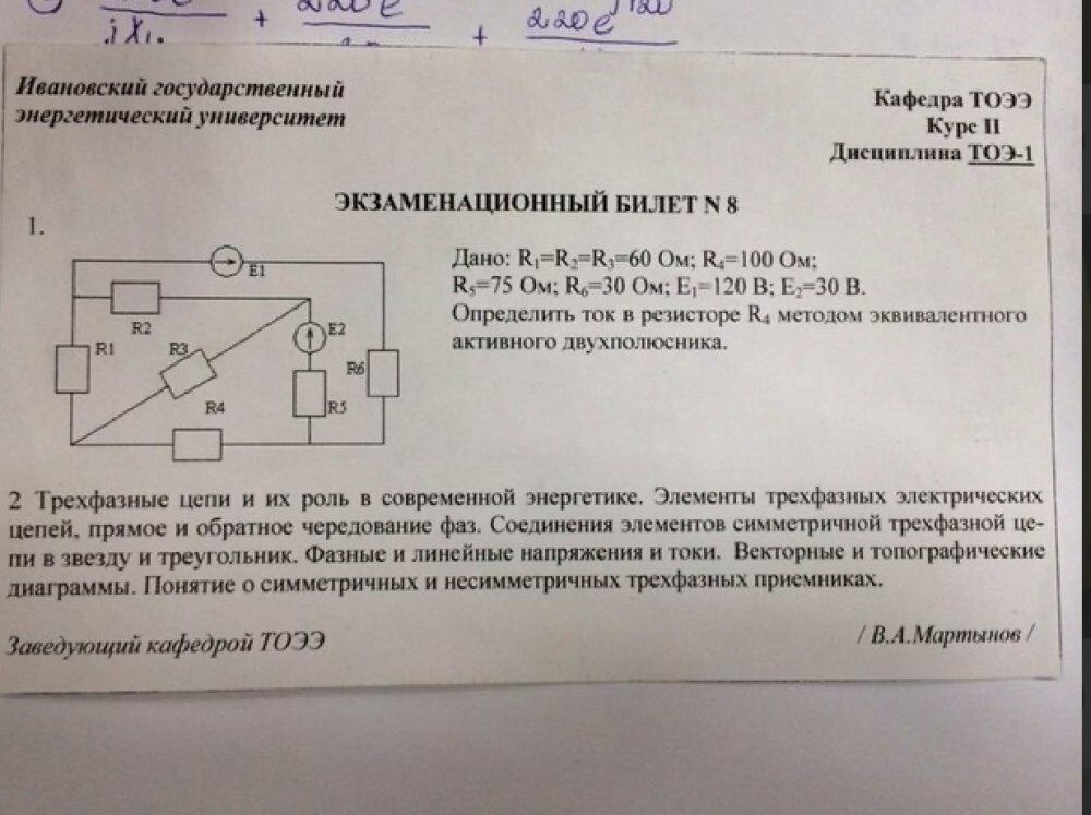Главная » Учебные материалы » Теоретические основы электротехники (ТОЭ) » Решения задач » ИГЭУ им. Ленина » 4 семестр » Номер 1 » Вариант 8 » R1=R2=R3=60 Ом; R4=100 Ом; R5=75 Ом; R6=30 Ом; Е1=120 В; Е2=30 В. Определить ток в резисторе R4 методом эквивалентного активного двухполюсника.