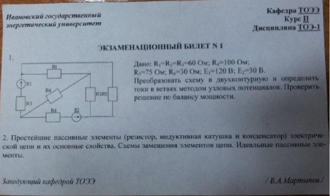 Для студентов ИГЭУ им. Ленина по предмету Теоретические основы электротехники (ТОЭ)R1=R2=R3=60 Ом; R4=100 Ом; R5=75 Ом; R6=30 Ом; E1=120 В; E2=30 В. Преобразовать схему в двухконтурную и определить токи в ветвях методом узловых потенR1=R2=R3=60 Ом; R4=100 Ом; R5=75 Ом; R6=30 Ом; E1=120 В; E2=30 В. Преобразовать схему в двухконтурную и определить токи в ветвях методом узловых потен