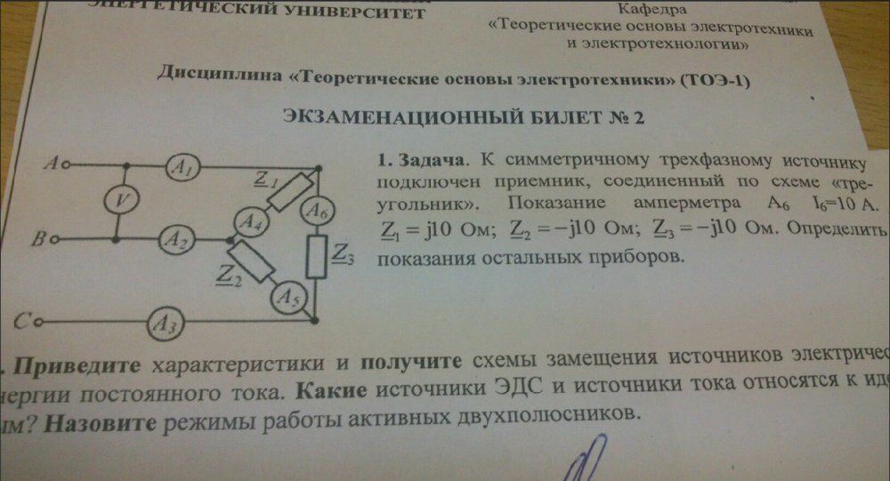 Главная » Учебные материалы » Теоретические основы электротехники (ТОЭ) » Решения задач » ИГЭУ им. Ленина » 4 семестр » Номер 1 » Вариант 2 » К симметричному трехфазному источнику подключен приемник, соединенный по схеме «треугольник». Показание амперметра A6 I6=10 А. Z1=j10 Ом; Z2=-j10 Ом; Z3=-j10 Ом. Определить показания остальных приборов.