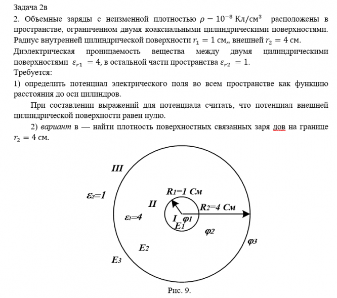 2. Объемные заряды с неизменной плотностью расположены в пространстве, ограниченном двумя коаксиальными цилиндрическими поверхностями. Радиус внутренней цилиндрической поверхности , внешней .