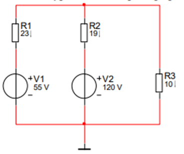 Е1 = 55 В, Е2 =120 В, R1 = 23 Ом, R2 = 19 Ом, R3 = 10 Ом, R01 = 2 Ом, R02 = 1 Ом