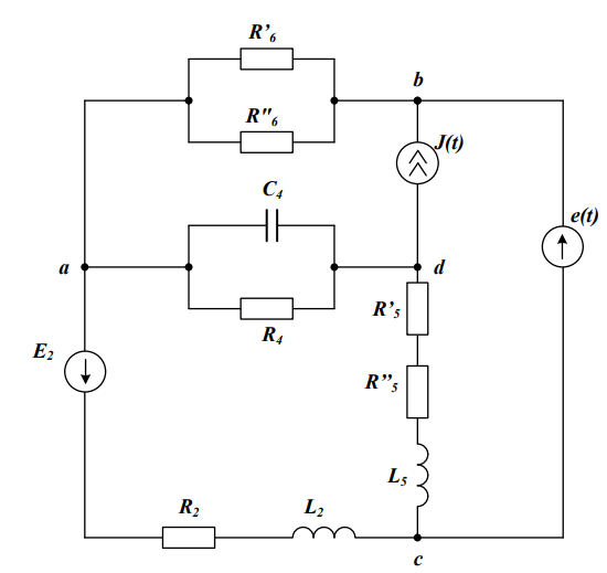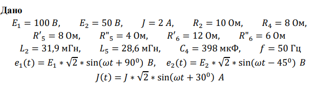 Для электрической цепи (Рис 1) необходимо выполнить Преобразовать схему, заменив ветви с параллельным и последовательным соединением резисторов на эквивалентные, и составить систему уравнений в дифференциальной форме. Представить сопротивления ветвей и действующие значения ЭДС и тока источников в комплексной форме и изобразить комплексную схему замещения цепи. В полученной схеме любым методом рассчитать комплексы действующих значений токов ветвей и напряжения на источнике тока. Составить баланс активных и реактивных мощностей источников энергии. Небаланс не должен быть больше 3%. Изобразить схему включения ваттметра для измерения активной мощности в ветви с индуктивностью L5 и определить его показание. Построить топографическую векторную диаграмму напряжений, совмещённую с лучевой векторной диаграммой токов. Потенциал узла а принять равным нулю.