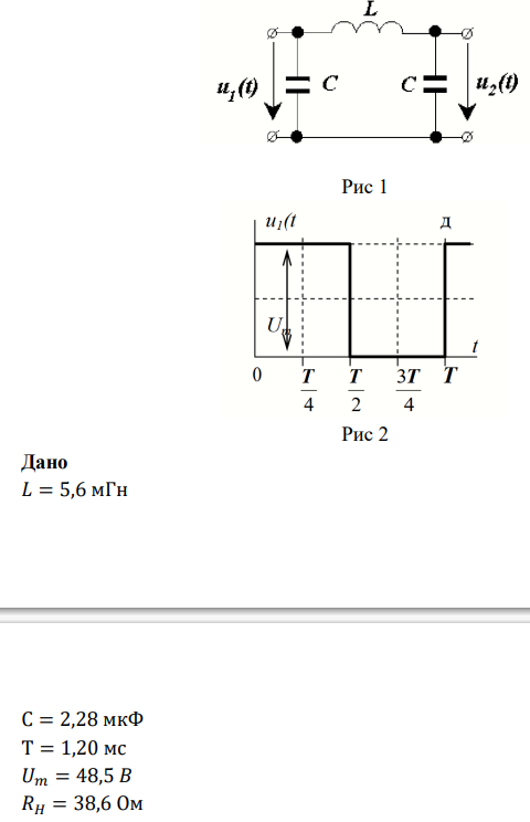На рис.1 изображена схема, на вход которой воздействует периодическое напряжение u1(t). Схема нагружена на активное сопротивление нагрузки Rн. Требуется: 1. Разложить напряжение u1(t) (Рис 2) в ряд Фурье до пятой гармоники включительно, используя табличные разложения, приведенные в учебниках, и пояснения, которые даны в указаниях к данной задаче. 2. Обозначив сопротивления элементов схемы в общем виде как Rн, jxL, – jxC, вывести формулу для напряжения на нагрузке U2m через комплексную амплитуду входного напряжения U1m. Полученное выражение пригодно для каждой гармоники, следует лишь учитывать, что 𝑋𝐿 = 𝑘𝜔𝐿 𝑋𝐶 = 1 𝑘𝜔𝐶 где k – номер гармоники 3. Используя формулу п. 2, определить комплексную амплитуду напряжения на выходе (на нагрузке) для 0, 1-й и 3-й гармоник ряда Фурье. 4. Записать мгновенное значение напряжения на нагрузке в виде ряда Фурье. 5. Построить друг под другом линейчатые спектры входного (U1) и выходного (U2) напряжений.