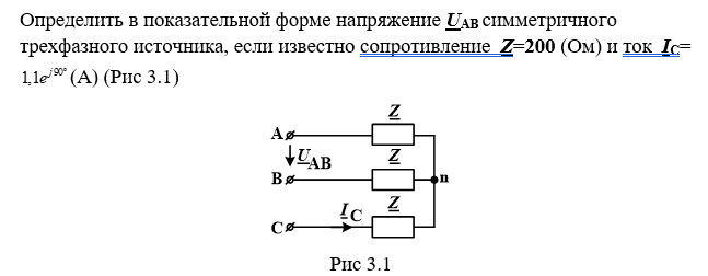 Определить в показательной форме напряжение UABсимметричного трехфазного источника, если известно сопротивление Z=200 (Ом) и ток IC=(А) (Рис 3.1)