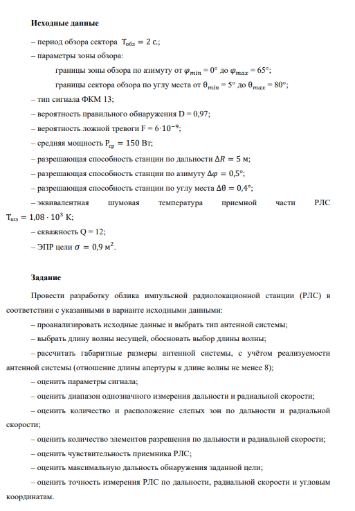 Провести разработку облика импульсной радиолокационной станции (РЛС) в соответствии с указанными в варианте исходными данными: – проанализировать исходные данные и выбрать тип антенной системы; – выбрать длину волны несущей, обосновать выбор длины волны; – рассчитать габаритные размеры антенной системы, с учётом реализуемости антенной системы (отношение длины апертуры к длине волны не менее 8); – оценить параметры сигнала; – оценить диапазон однозначного измерения дальности и радиальной скорости; – оценить количество и расположение слепых зон по дальности и радиальной скорости; – оценить количество элементов разрешения по дальности и радиальной скорости; – оценить чувствительность приемника РЛС; – оценить максимальную дальность обнаружения заданной цели; – оценить точность измерения РЛС по дальности, радиальной скорости и угловым координатам.