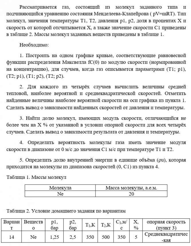 Для студентов МГТУ им. Н.Э.Баумана по предмету Теоретические основы вакуумной техники (ТОВТ-Э5)ДЗ №2 - Рассматривается газ, состоящий из молекул заданного типа и подчиняющийся уравнению состояния Менделеева-КлапейронаДЗ №2 - Рассматривается газ, состоящий из молекул заданного типа и подчиняющийся уравнению состояния Менделеева-Клапейрона