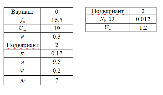 Модулированные колебания- Несущее гармоническое колебание, имеющее амплитуду Um, В, частоту f0, Гц, и начальную фазу фи, рад модулируется по амплитуде гармоническим колебанием, имеющим частоту F, амплитуду A и начальную фазу пси (все параметры даны в таблице).