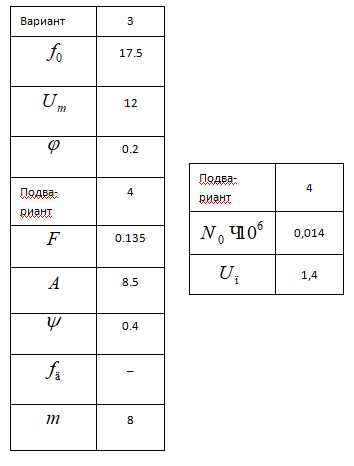 Модулированные колебания- Несущее гармоническое колебание, имеющее амплитуду Um, В, частоту f0, Гц, и начальную фазу фи, рад модулируется по амплитуде гармоническим колебанием, имеющим частоту F, амплитуду A и начальную фазу пси (все параметры даны в таблице).