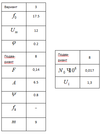 Модулированные колебания- Несущее гармоническое колебание, имеющее амплитуду Um, В, частоту f0, Гц, и начальную фазу фи, рад модулируется по амплитуде гармоническим колебанием, имеющим частоту F, амплитуду A и начальную фазу пси (все параметры даны в таблице).