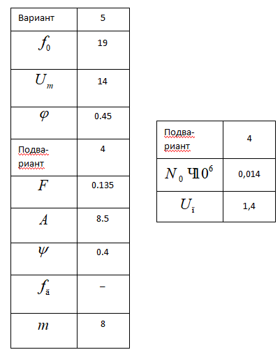 • Несущее гармоническое колебание, имеющее амплитуду Um, В, частоту f0, Гц, и начальную фазу фи, рад модулируется по амплитуде гармоническим колебанием, имеющим частоту F, амплитуду A и начальную фазу пси (все параметры даны в таблице).