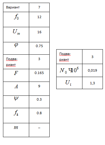 • Несущее гармоническое колебание, имеющее амплитуду Um, В, частоту f0, Гц, и начальную фазу фи, рад модулируется по амплитуде гармоническим колебанием, имеющим частоту F, амплитуду A и начальную фазу пси (все параметры даны в таблице).