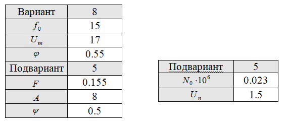 Модулированные колебания- Несущее гармоническое колебание, имеющее амплитуду Um, В, частоту f0, Гц, и начальную фазу фи, рад модулируется по амплитуде гармоническим колебанием, имеющим частоту F, амплитуду A и начальную фазу пси (все параметры даны в таблице).