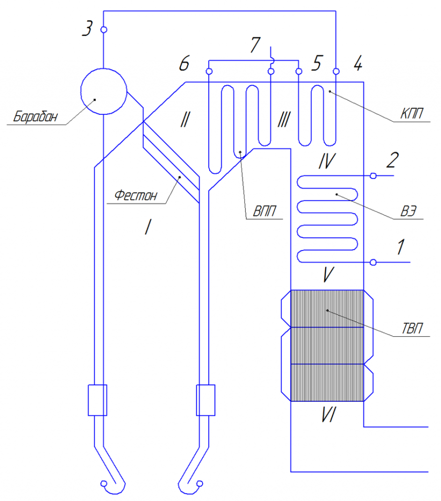 Топливо вместе с воздухом подается через горелки в топочную камеру, где сжигается факельным способом. На стенах топочной камеры расположены экраны, состоящие из большого числа вертикальных труб, и на выходе из топки – фестон, которые образуют испарительные поверхности нагрева, получающие часть теплоты продуктов сгорания. Естественная циркуляция воды и пароводяной смеси в системе организуется за счет разности масс столба воды в опускных трубах и пароводяной смеси в подъемных трубах экранов и фестона.