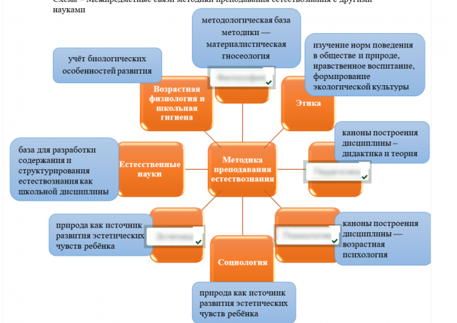 Методика преподавания естествознания функционирует в содружестве с психолого-педагогическими, общественными и другими науками. Изучите схему «Межпредметные связи методики преподавания естествознания с другими науками» и дополните блоки с недостающими наименованиями наук, в соответствии с определениями. Схема - Межпредметные связи методики преподавания естествознания с другими науками методологическая база методики материалистическая гносеология изучение норм поведения в обществе и природе, нравственное воспитание, формирование экологической культуры учёт биологических особенностей развития Возрастная физиология и школьная гигиена база для разработки содержания и структурирования естествознаниякак школьной дисциплины каноны построения дисциплины - дидактика и теория Естесственные науки Методика преподавания естествознания природа как источник развития эстетических чувств ребёнка каноны построения дисциплины возрастная психология Социология природа как источник развития эстетических чувств ребёнка .