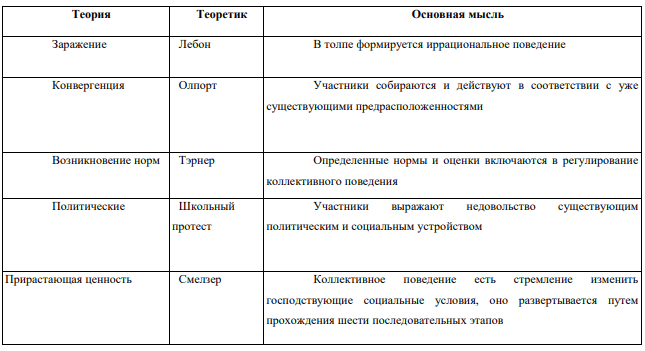 3. Выберите какую-либо идею, постепенно овладевающую массовым сознанием, и опишите этапы её адаптации в обществе или микросоциуме (в вашем окружении или известной вам группе). Примеры таких идей, постепенно распространяющихся среди больших групп людей - движение Black Lives Matter; культура отмены или другие формы остракизма в отношении какойлибо личности, а в случае последующего оправдания этой личности – её реабилитация; перестройка и гласность в середине и конце 1980-х гг. в СССР; необходимость вакцинации от ковида; ковид-диссидентство; и т.п. При описании руководствуйтесь тезисом Э. Роджерса о шести этапах, через которые проходит процесс адаптации идеи: 1. Внимание. 1. Интерес. 3. Оценка. 4. Проверка. 5. Адаптация. 6. Признание 4. Нил Смелзер свел ряд теорий коллективного поведения в следующую таблицу – скопируйте её и заполните её своими примерами![]()