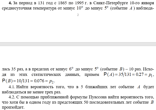 За период в 131 год с 1865 по 1995 г. в Санкт-Петербурге 10-го января среднесуточная температура от минус до минус (событие ) наблюдалась 35 раз, а в пределах от минус до минус (событие ) – 10 раз. Исходя из этих статистических данных, примем , .