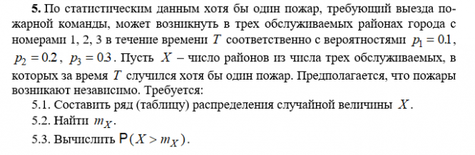 По статистическим данным хотя бы один пожар, требующий выезда пожарной команды, может возникнуть в трех обслуживаемых районах города с номерами 1, 2, 3 в течение времени соответственно с вероятностями , , . Пусть – число районов из числа трех обслуживаемых, в которых за время случился хотя бы один пожар. Предполагается, что пожары возникают независимо. Требуется: