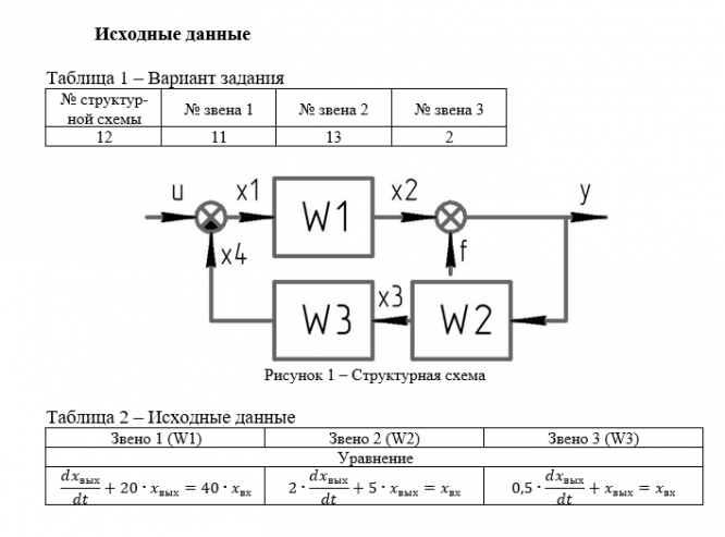 По номерам звеньев 1, 2, 3 по таблице 2 выбирается соответствующее уравнение звена. В таблице 2 приведены условные обозначения сигналов входа и выхода системы (Xвх и Xвых). При записи уравнений необходимо заменить условные сигналы соответствующими структурной схеме варианта сигналами.