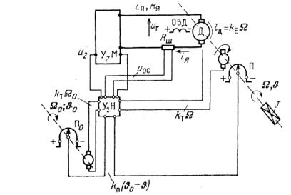 В этой системе введены обратные связи по углу поворота, угловой скорости вращения и тока в цепи якоря двигателя.