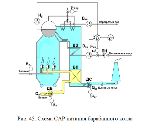 3.4. Система автоматического регулирования температуры воздуха, подаваемого в топку котла На рис. 45 показана схема САР питания барабанного котла. Принято, что максимально допустимые отклонения уровня воды в барабане составляют ±100 мм от среднего значения, установленного заводом-изготовителем. Среднее значение уровня может не совпадать с геометрической осью барабана. Максимально допустимые отклонения уточняют в процессе эксплуатации. Снижение уровня за пределы водомерного стекла, устанавливаемого на барабане, считается «упуском» воды, а превышение его верхней видимой части – «перепиткой». Расстояние между этими критическими отметками 400 мм. В переходных режимах изменение уровня происходит довольно быстро, поэтому регулятор питания для обеспечения малых отклонений уровня должен поддерживать постоянство соотношения расходов питательной воды и пара. Эту задачу выполняет регулятор, который перемещает клапан при появлении сигнала небаланса между расходами питательной воды GПВ в и пара GПП . В качестве объекта регулирования в данной системе целесообразно рассматривать барабан. В таком случае регулирующим воздействием на входе объекта будет расход топлива (природный газ или жидкое топливо – мазут) ( ) G p T , посредством изменения которого обеспечивается компенсация отклонений уровня в барабане котла H p( ) , возникающих вследствие изменения внешних возмущающих воздействий (изменения расхода питательной воды в барабане котла ( ) G p ПВ и расход пара, уходящего из котла ( ) G p П . При исследовании САР в качестве главного возмущения следует рассматривать изменения расхода питательной воды в барабане, приняв условно, что все остальные возмущающие факторы постоянны.