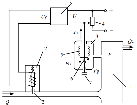 На рис. 48 приведена схема САР давления Р в ресивере (воздухосборнике) 1, который является в данной системе объектом регулирования. Давление в ресивере регулируется посредством изменения количества воздуха Q, зависящего от положения заслонки 2, то есть от ее линейного перемещения ХЗ, которое можно рассматривать как регулирующее воздействие на входе объекта регулирования. Внешним возмущением, вызывающим отклонение регулируемой величины – давления Р, является изменение расхода сжатого воздуха QC.