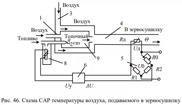 На рис. 46 приведена САР температуры Θ воздуха, подаваемого в зерносушилку из системы подогрева, включающей в себя теплогенератор 1 с форсункой 2 для распыления жидкого топлива и трубопроводы 3 и 4 для смешивания воздуха и топочных газов. Температура воздуха Θ контролируется датчиком температуры – терморезистором RД, включенным в мостовую схему 5, которая с помощью резистора R0 обеспечивает задание требуемого значения температуры воздуха, подаваемого в зерносушилку. Посредством мостовой схемы также сравнивается напряжение U, пропорциональное температуре Θ, с задающим напряжением U0 (мостовая схема одновременно выполняет функции задающего и сравнивающего органов). Сигнал разбаланса мостовой схемы (сигнал рассогласования) ΔU=U0–U усиливается электронным усилителем 6, выходное напряжение которого UУ управляет заслонкой 7 с 51 помощью электромагнита 8. За счет соответствующего изменения перемещения Х заслонки обеспечивается изменение количества топлива q, сжигаемого в камере сгорания 9 теплогенератора. Тем самым регулируется величина температуры воздуха.