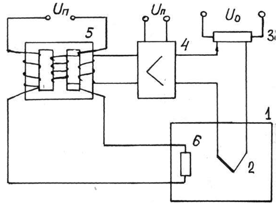 Согласно техническим условиям во внутреннем объеме электрической печи 1 требуется поддерживать постоянную температуру. Температура измеряется термопарой 2. Термо-э. д. с термопары сравнивается с напряжением задающего потенциометра 3 и разностный сигнал усиливается электронным усилителем 4, а затем выходным магнитным усилителем 5. Нагревательный элемент 6, питаемый выходным током магнитного усилителя обогревает печь.