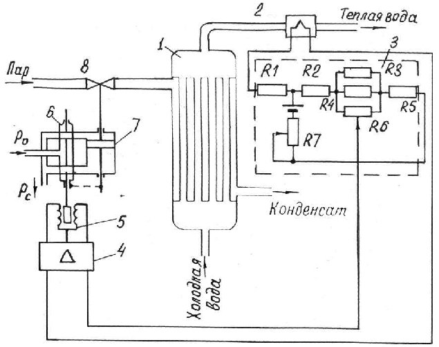 Холодная вода поступает в теплообменник 1 без регулирования расхода и проходя через аппарат нагревается паром. Температура теплой воды Q измеряется термопреобразователем 2, включаемым в схему задатчика температуры 3, состоящего из резисторов R1 - R5, и двух потенциометров R6, R7. Перемещением потенциометра R6 задается температура теплой воды. Напряжение рассогласования подается на вход усилителя 4. Сигнал с выхода усилителя подается в катушку соленоида 5, перемещающего золотник пневматического распределителя 6. Последний управляет работой пневматического исполнительного механизма 7 с помощью которого изменяется положение клапана 8, регулирующего подачу пара в теплообменник.