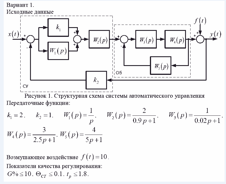 Показать/скрыть дополнительное описаниеАнализ и синтез системы автоматического управления. Привести исходную структурную схему к типовой одноконтурной системе автоматического управления. По полученной передаточной функции объекта управления записать: линейное дифференциальное уравнение объекта управления и привести его к стандартной форме записи; получить описание объекта управления через нули полюса и коэффициенты усиления системы; получить описание объекта управления в форме матрицы пространства состояния. Найти передаточную функцию системы по задающему и возмущающему воздействию. Записать уравнение динамики АСУ. Исследовать объект управления на устойчивость алгебраическими и частотными методами, определить запас устойчивости.