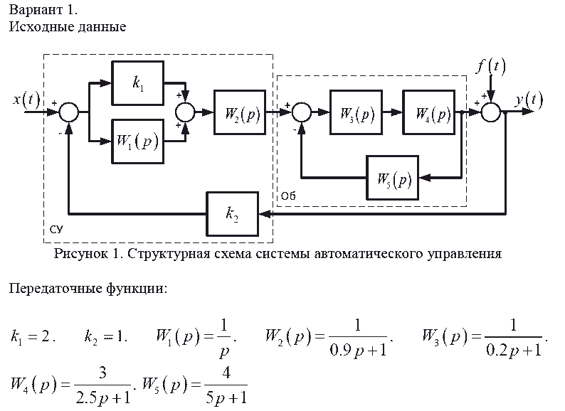 Показать/скрыть дополнительное описаниеАнализ и синтез системы автоматического управления. Привести исходную структурную схему к типовой одноконтурной системе автоматического управления. По полученной передаточной функции объекта управления записать: линейное дифференциальное уравнение объекта управления и привести его к стандартной форме записи; получить описание объекта управления через нули полюса и коэффициенты усиления системы; получить описание объекта управления в форме матрицы пространства состояния. Найти передаточную функцию системы по задающему и возмущающему воздействию. Записать уравнение динамики АСУ. Исследовать объект управления на устойчивость алгебраическими и частотными методами, определить запас устойчивости.